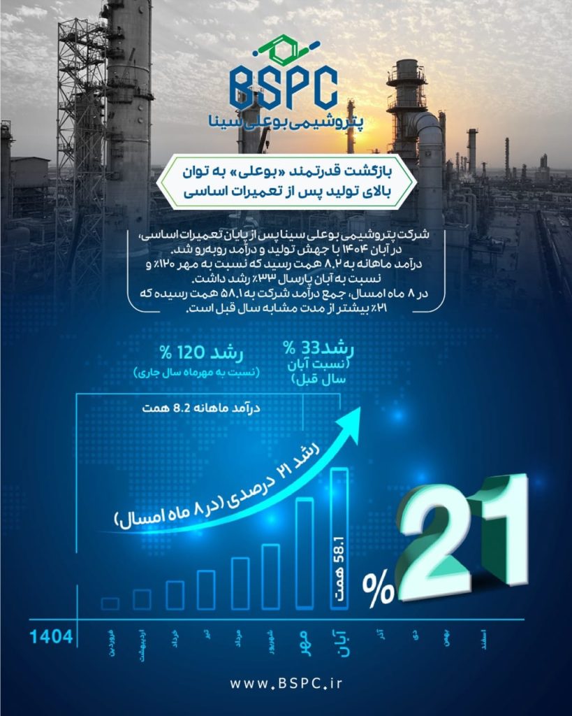 اوجگیری دوباره بوعلی پس از اورهال سنگین؛ ثبت جهش ۱۲۱ درصدی درآمد و دوبرابر شدن تولید در آبانماه ۱۴۰۴